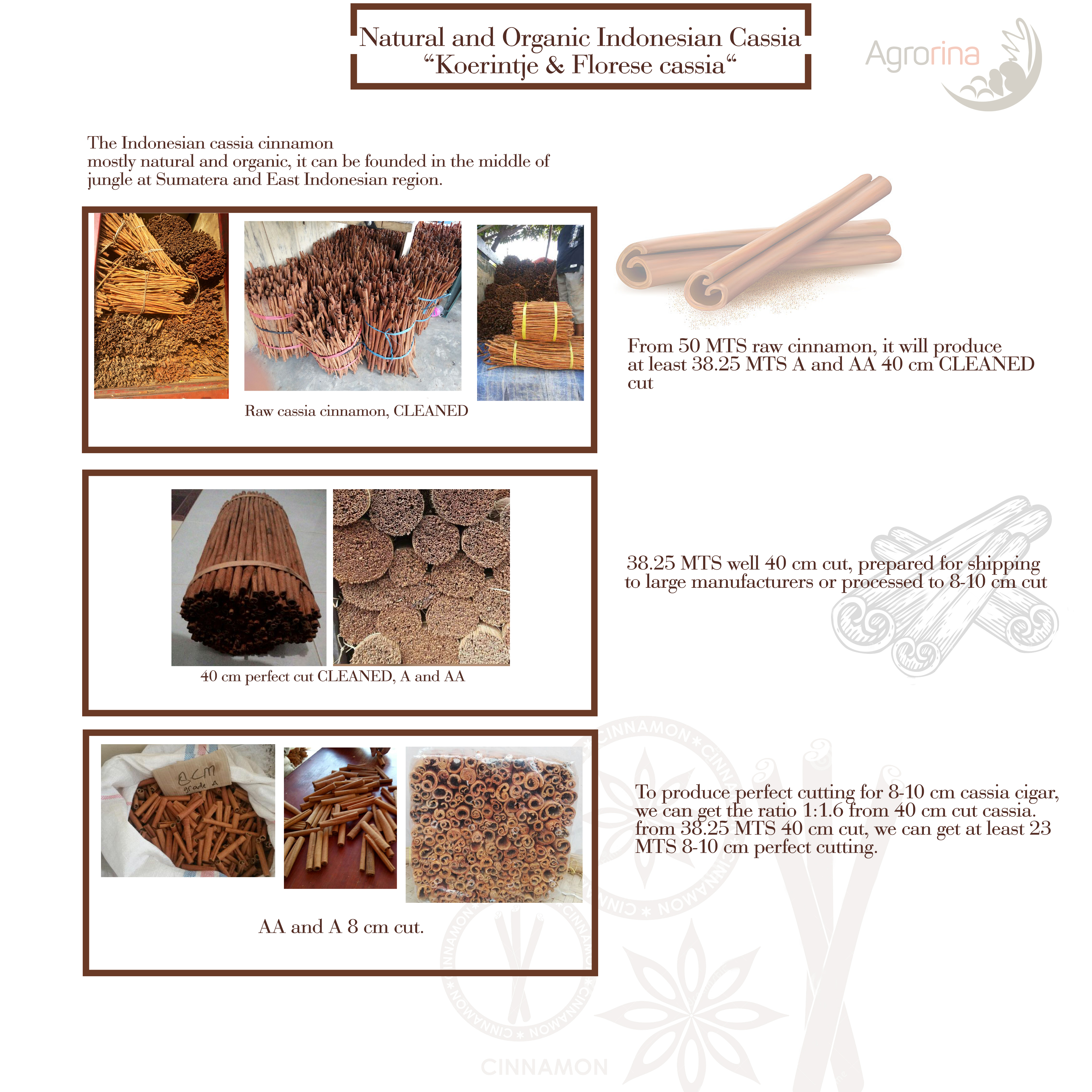 The Indonesian cassia cinnamon absolutely different from other countries. The Indoneisan cassia is the high grade cassia, its called "koerintje". We can distinguish the Indonesian cassia cinnamon with other cassia or ceylon by color, most of Indonesian cassia has brown-reddish color because it growth in the mountain slope, so its free from any chemical and metal contamination. It also growth naturally and fertilized by compost, it makes Indonesian "koerintje" cassia as the highest grade for cassia and of course more aromatic and spicy flavor. That makes Indonesian cassia be the top sought cinnamon.