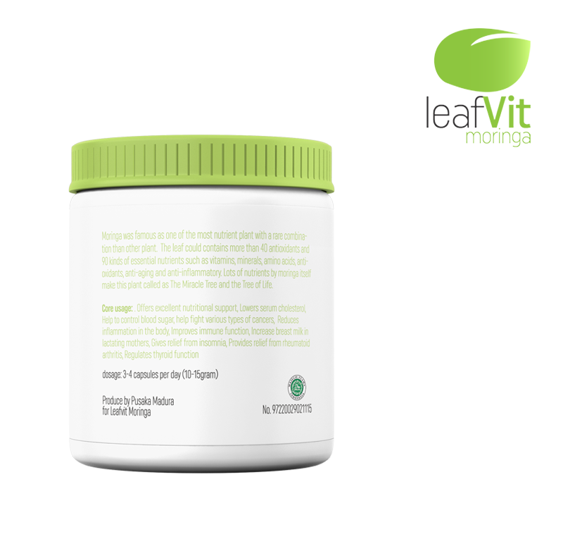 Moringa was famous as one of the most nutrient plant with a rare combination than other plant. Scientific reported that contains more than 40 antioxidants and 90 kinds of essential nutrients such as vitamins, minerals, amino acids, antioxidants, anti-aging and anti-inflammatory. By these information, we are in responsible to bringing the benefit of moringa to all people by encapculate the moringa output, so it could consume easily